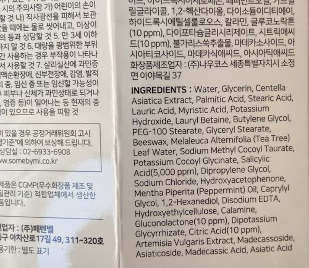 Water, Glycerin, Centella Asiatica Extract, Palmitic Acid, Stearic Acid, Lauric Acid, Myristic Acid, Potassium Hydroxide, Lauryl Betaine, Butylene Glycol, PEG-100 Stearate, Glyceryl Stearate, PEG-8 Beeswax, Melaleuca Alternifolia Leaf Water, Sodium Methyl Cocoyl Taurate, Potassium Cocoyl Glycinate, Salicylic Acid, Dipropylene Glycol, Sodium Chloride, Hydroxyacetophenone, Mentha Piperita Oil, Caprylyl Glycol, 1,2-Hexanediol, Disodium EDTA, Hydroxyethylcellulose, Calamine, Gluconolactone, Dipotassium Glycyrrhizate, Citric Acid, Artemisia Vulgaris, Madecassoside, Asiaticoside, Madecassic Acid, Asiatic Acid