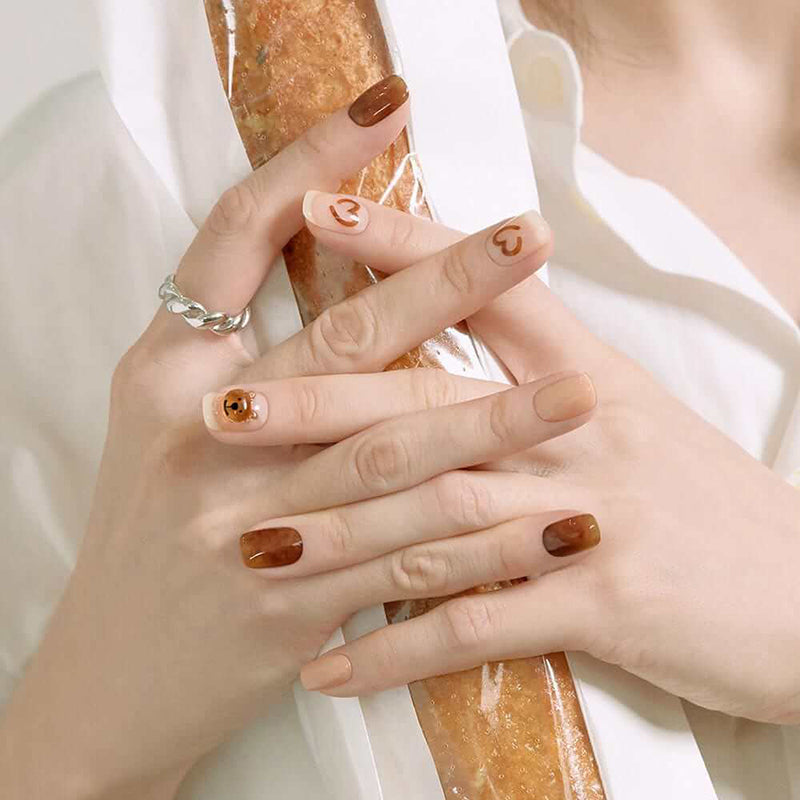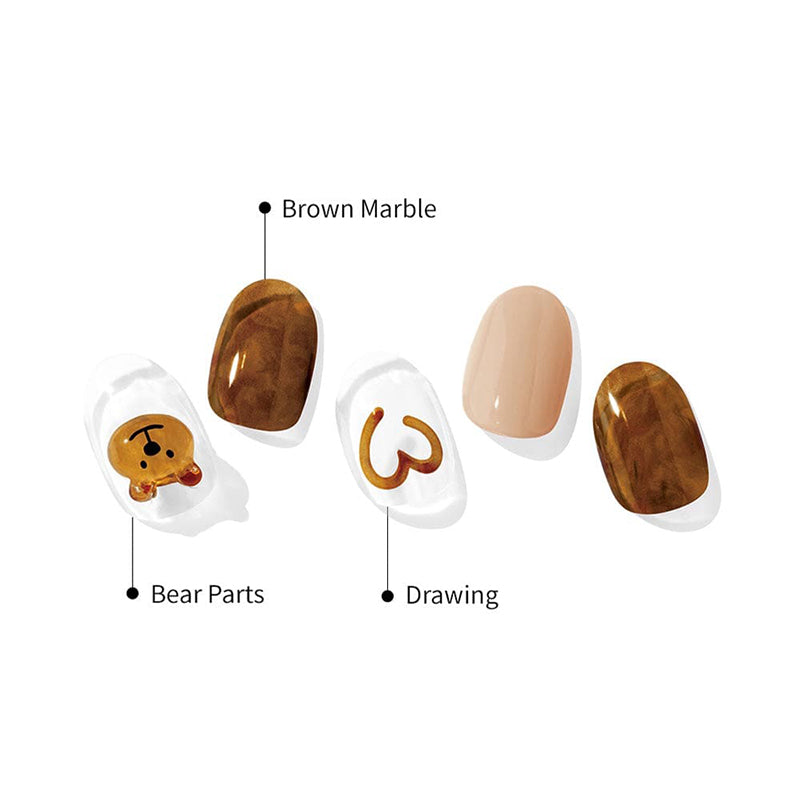 I bought these being so excited about the bear element but ended up a little disappointed. The beige and brown nails look as amazing as the other fully colored nail sets I have but the hear and bear nails don't look as good in my opinion. Since they are completely see through you can see the natural nail underneath and I personally don't like the look of that. I would prefer a natural-nail-colored base. Also, the bear has a thick seethrough element on top of it which makes applying it very hard, the nail does not bend easily to the shape of the natural nail.
